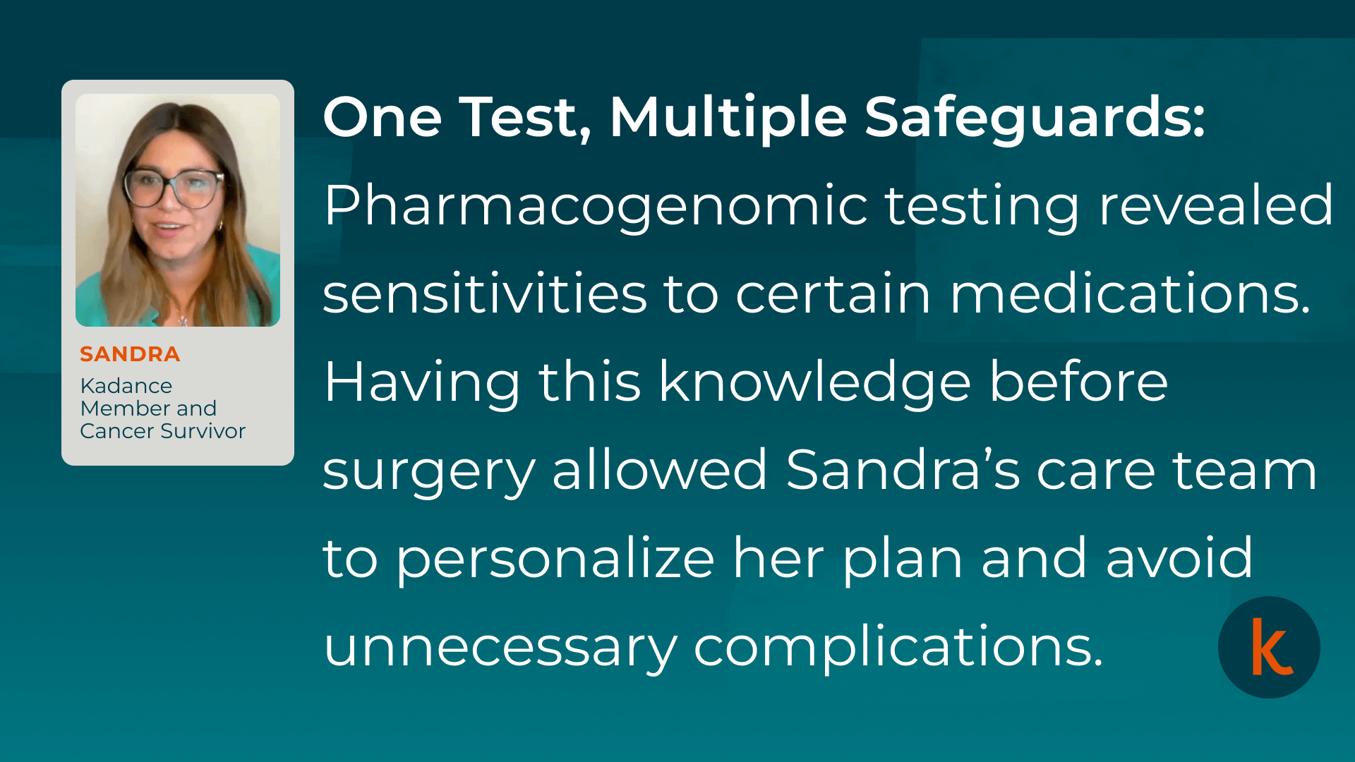 When Sandra, a nurse and mother, was diagnosed with triple-negative breast cancer, she faced fear, confusion, and limited options. Through Kadance, she found clarity and supportive care. Her Oncology Nurse Navigator guided her every step, connecting her with advanced diagnostic testing that revealed new treatment possibilities and provided peace of mind. Pharmacogenomic and liquid biopsy testing helped her doctors personalize her care and ease her anxiety. Sandra says Kadance turned chaos into calm, helping her focus on healing and her family. Watch below to see how Sandra’s journey with Kadance brought clarity, confidence, and a renewed sense of control.